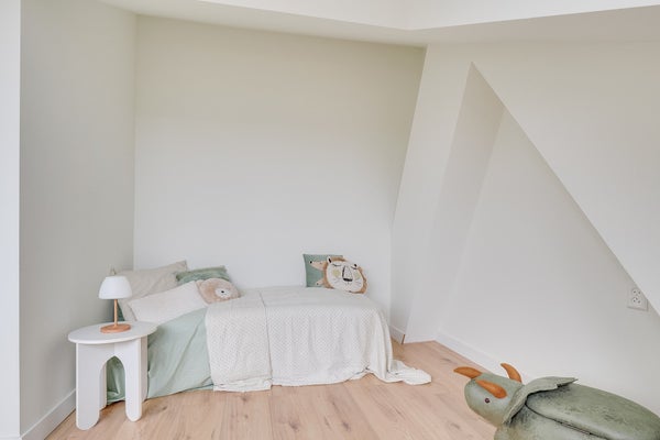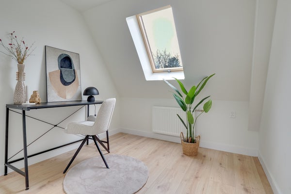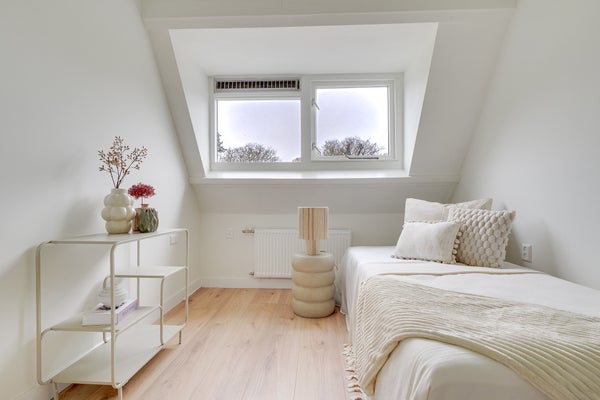 Overloop met drie slaapkamers, waarvan twee met dakkapel. De grootste kamer beschikt over praktische inbouwbergruimte, de kleinste over een dakraam. Karaktervolle details zoals zichtbare hanenbalken maken deze verdieping extra sfeervol.
