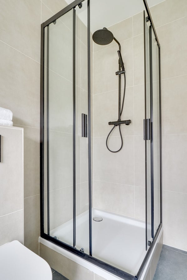 Overloop met toegang tot twee ruime slaapkamers. Moderne badkamer met ligbad onder het raam, inloopdouche, tweede toilet en wastafelmeubel.