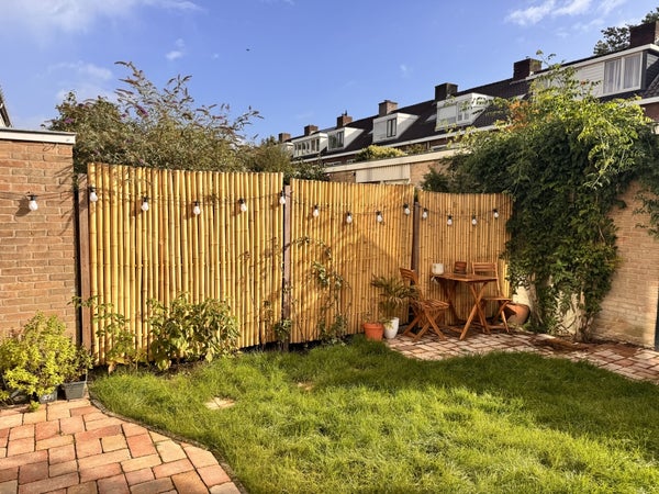 Nette voortuin met trampoline en achtertuin met achterom. De garage (met dakvenster) is bereikbaar via de zijdeur achter in de tuin en uiteraard via de (elektrische) garagedeur aan de zijde van de Naberlaan. Er is een buitenkraan en een afvoer aanwezig.
