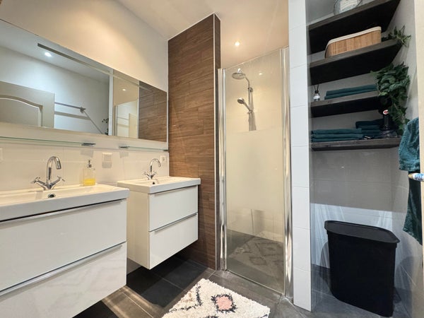 Op de eerste verdieping bevinden zich twee comfortabele slaapkamers en een moderne badkamer uitgerust met een dubbele wastafel en een aparte douche.