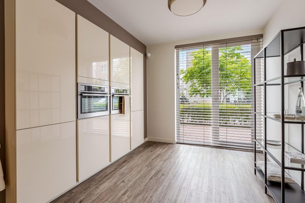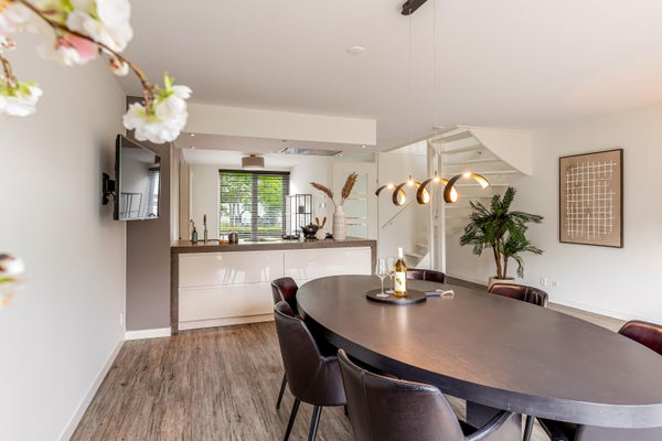 Entree, hal met meterkast, toiletruimte en toegang tot de royale leefkeuken. Aan de voorzijde bevindt zich een moderne en zeer complete keuken, uitgerust met o.a. een combi-oven/magnetron, stoomoven, vaatwasser, Quooker en strak geïntegreerde kookpitten in het werkblad. De sfeervolle gashaard en de openslaande deuren naar de achtertuin zorgen voor een warme en uitnodigende leefruimte. De achtertuin beschikt over een aangebouwde berging en vormt een natuurlijke overgang naar het privéterras en de gemeenschappelijke binnentuin.