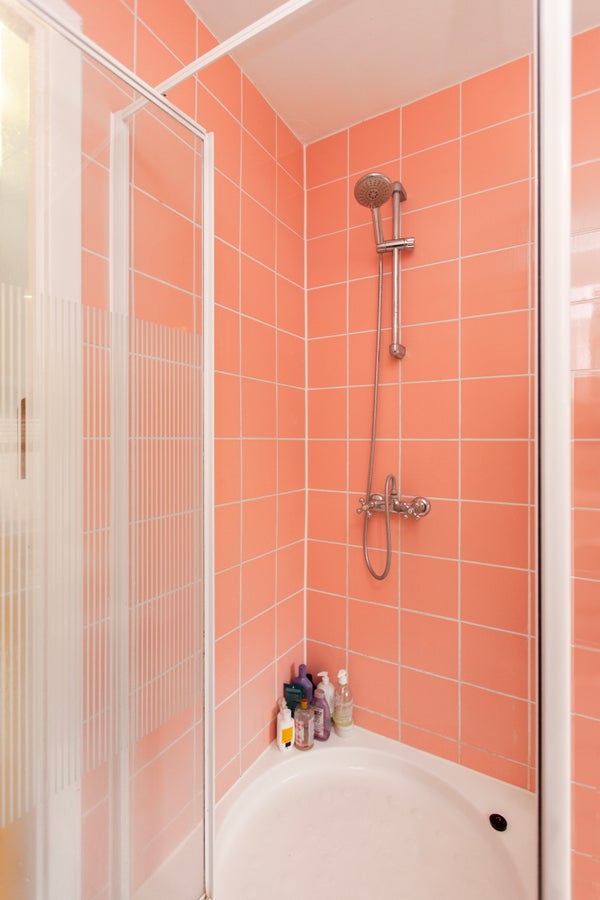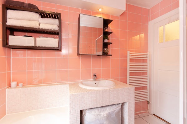 De ruime badkamer is uitgerust met een ligbad, inloopdouche, toilet, wastafel en een handdoekenradiator.