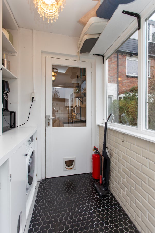 De keuken is voorzien van alle benodigde inbouwapparatuur, waaronder een gasfornuis met afzuigkap, vaatwasser, oven, koelkast en vriezer. Vanuit de keuken loopt u door naar de bijkeuken, waar de wasmachine en droger zijn geplaatst. Ook vanuit de bijkeuken heeft u toegang tot de tuin.