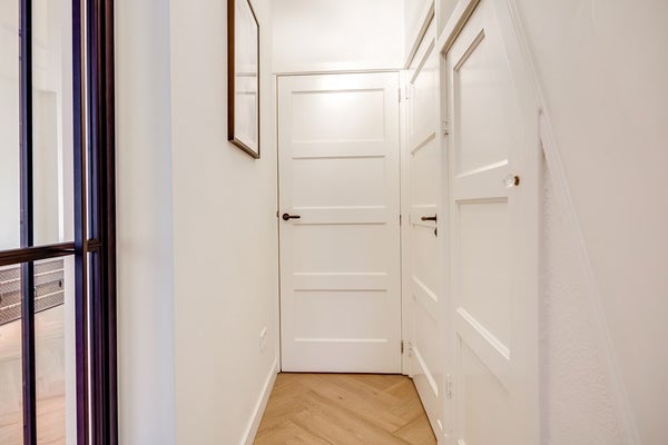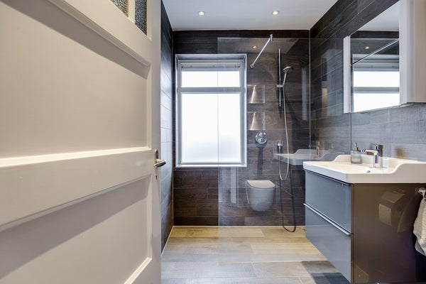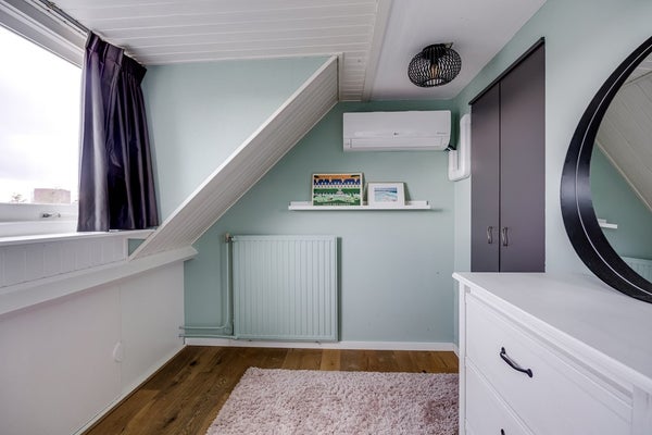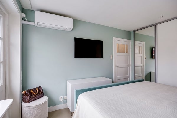 Op de eerste verdieping bevinden zich twee ruime slaapkamers (waarvan de master bedroom met airconditioning), een kleinere kinder-/werkkamer en een luxe badkamer met inloopdouche, hangend toilet, vloerverwarming, handdoekradiator en wastafelmeubel.
