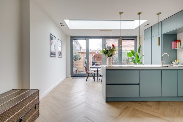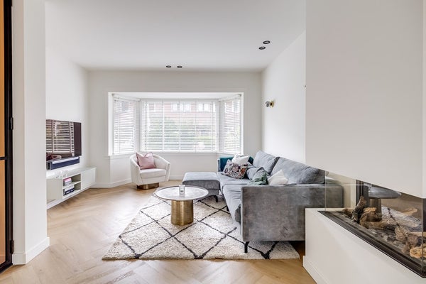 Via de entree bereik je de hal met toilet, garderobekast en trapkast. De ruime woonkamer beslaat de volledige lengte van de woning en beschikt over vloerverwarming en een sfeervolle gashaard. Aan de achterzijde opent een grote glazen pui - volledig te openen - naar de zonnige tuin, waardoor binnen en buiten mooi in elkaar overlopen.
