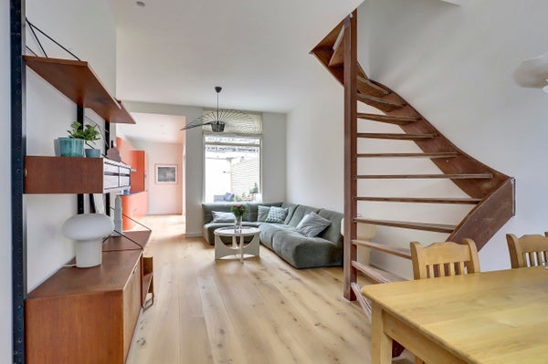 Op de gehele begane grond ligt een houten vloer. De trap naar de 1e verdieping bevindt zich in de woonkamer.