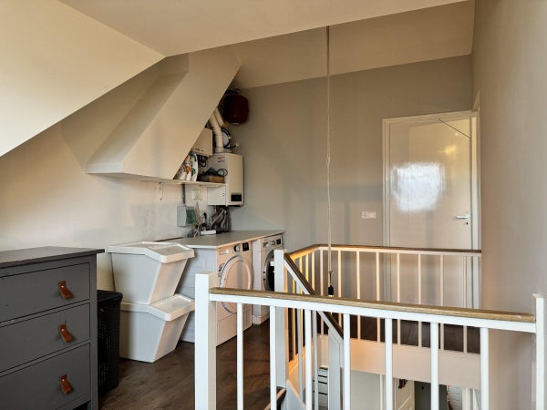 vía de trapopgang is de overloop te bereiken met de wasmachine en wasdroger opstelplaats. Tevens is hier een wastafel gemaakt. Via de overloop is de hoofdslaapkamer te bereiken.
