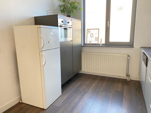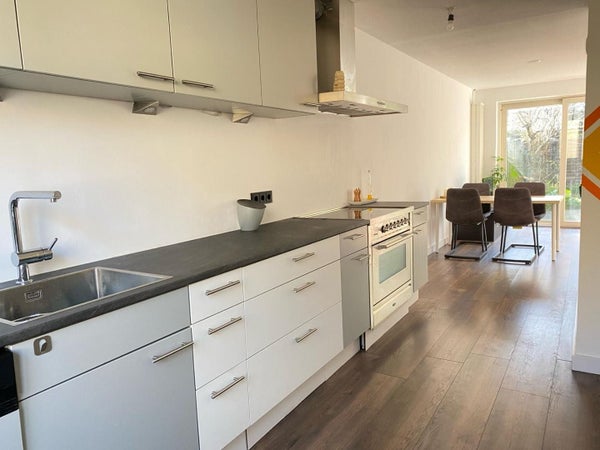 Aan de voorzijde van de woning vind je de halfopen keuken. Deze is uitgerust met een moderne Boretti inductie fornuis met een grote oven, Boretti combi magnetron, koelkast, afzuigkap en een vaatwasser. De woonkamer met openslaande deuren naar de zonnige tuin is voorzien van een laminaat vloer.