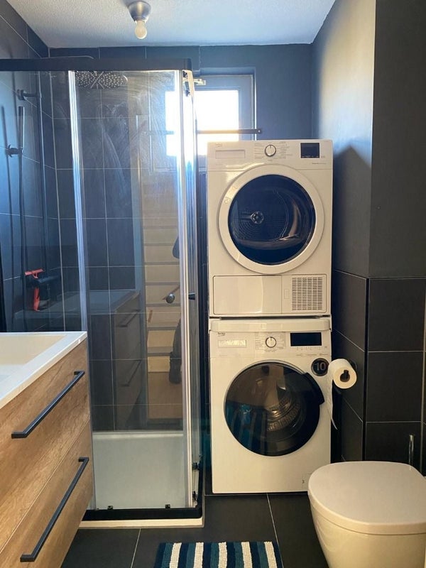 Eerste verdieping: Overloop, 2 slaapkamers, douche, toilet, wastafel, wasmachine en droger.