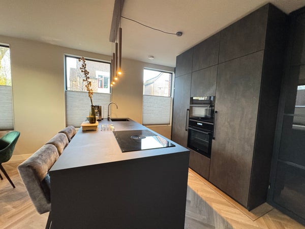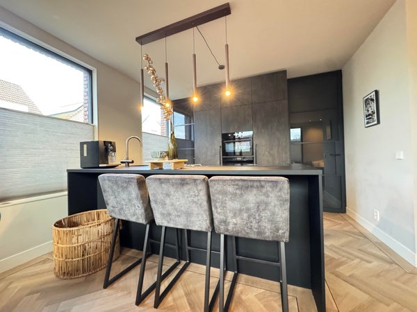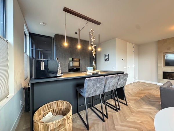 Indeling: entree, hal met toilet en opbergkast. Toegang tot lichte woonkamer met gashaard. Open moderne luxe zwarte keuken met inbouwapparatuur en bar.