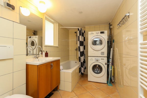 De badkamer bevindt zich eveneens op de begane grond en is voorzien van een bad met douche, toilet en wastafel. Ook de wasmachine en droger zijn hier geplaatst.