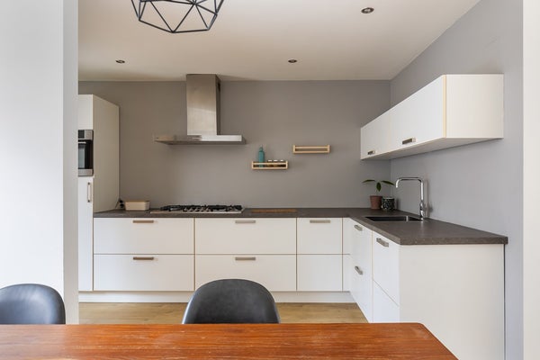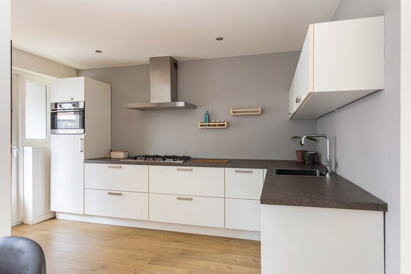 Bij binnenkomst valt meteen de royale woonkamer op. Dankzij de grote ramen aan de voorzijde en het open karakter van de ruimte is het hier heerlijk licht. De woonkamer loopt vloeiend over in de moderne open keuken, die is voorzien van alle inbouwapparatuur die je nodig hebt: een vaatwasser, combioven, koelkast en een 5-pits gasfornuis.