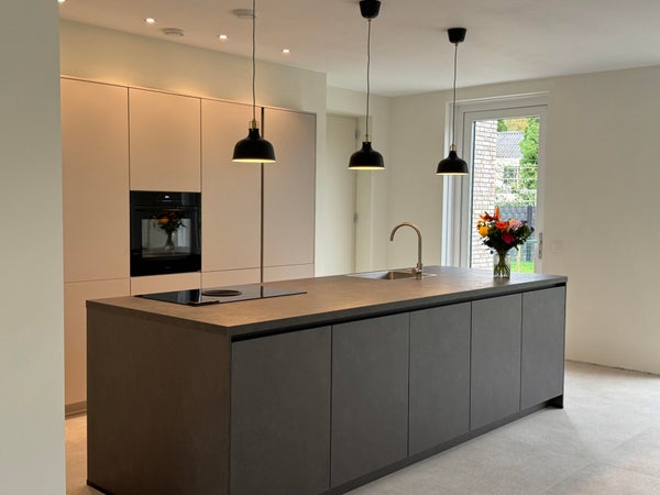 De keuken is opgebouwd uit een groot eiland met o.a. spoelbak, vaatwasser en een bora inductie kookplaat. Verder is er een kasten wand van 3 m met o.a. een grote combi oven/magnetron, een grote koelkast met vriesdeel en veel opbergruimte.
