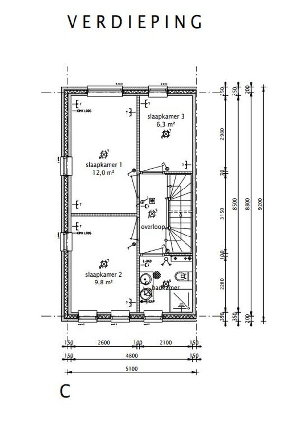Eerste verdieping: overloop met vaste trap naar de zolder, badkamer met douche, dubbele wastafel, designerradiator en toilet. Drie ruime slaapkamers van 12, 9,8 en 6,3 m².
