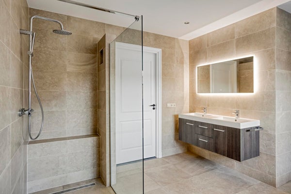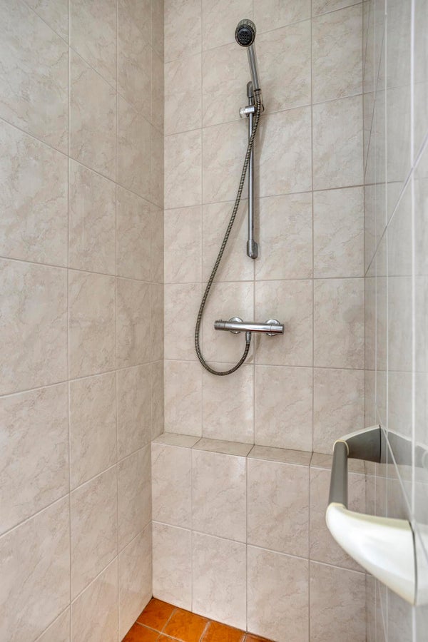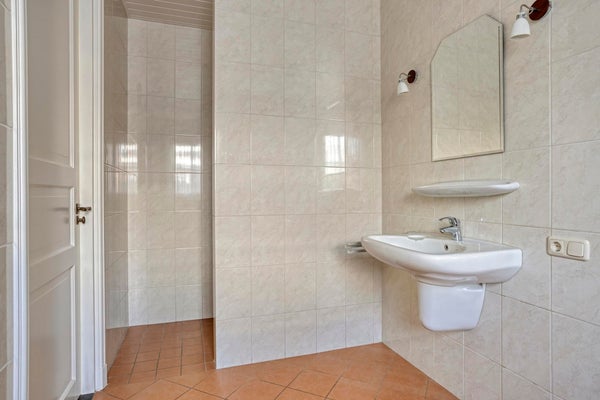 Direct grenzend aan de hal bevindt zich een slaapkamer op de begane grond met een eigen ensuite badkamer, volledig betegeld en voorzien van een inloopdouche, toilet en wastafel.