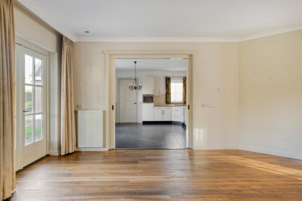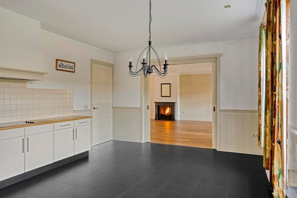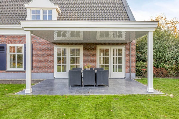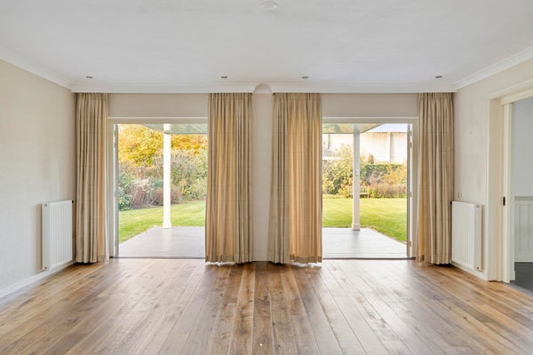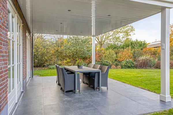 Grote schuifdeuren geven toegang tot de lichte woonkamer, die is voorzien van een sfeervolle gashaard. Vanuit de woonkamer leiden dubbele openslaande deuren naar het overkapte buitenterras.