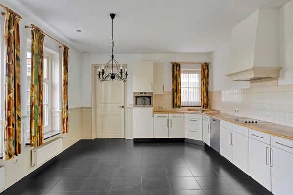 Vanuit de hal betreed je de ruime keuken, uitgerust met een koelkast, vaatwasser, 4-pits inductiekookplaat, afzuigkap, combi-oven en volop werk- en bergruimte.