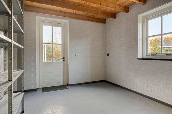 Aan de andere zijde van de keuken bevindt zich een tweede hal met toegang tot een aparte toiletruimte, een praktische wasruimte, de achtertuin en de aangebouwde garage geschikt voor één auto en meerdere fietsen, met extra bergruimte in de nok.