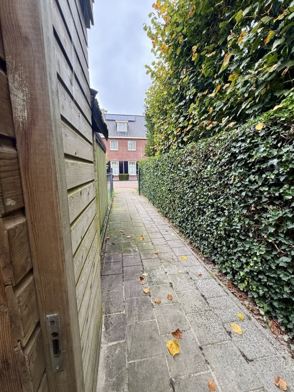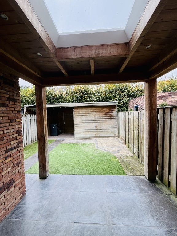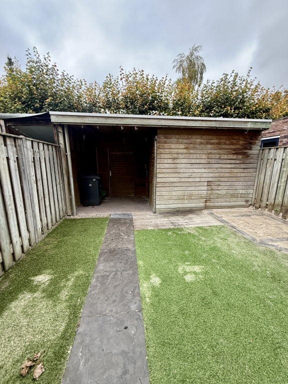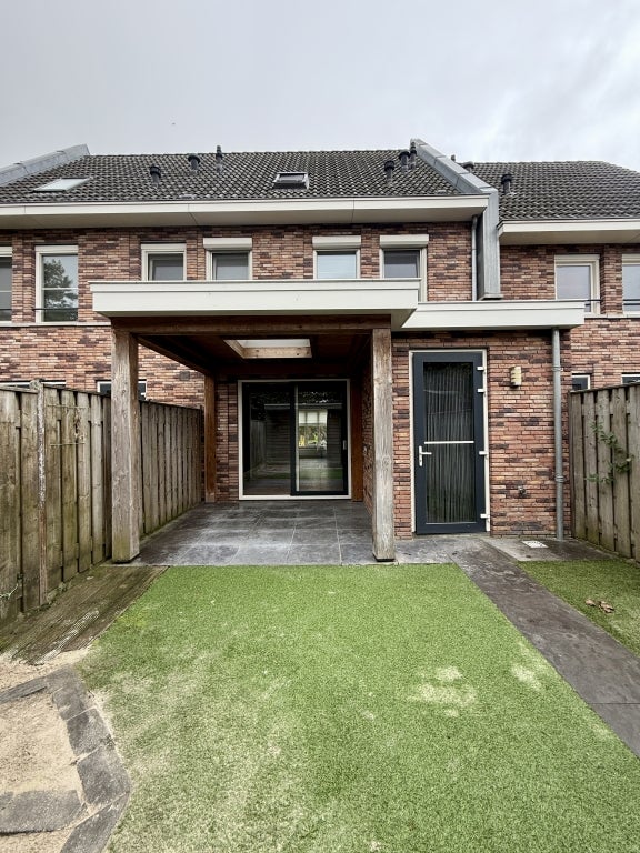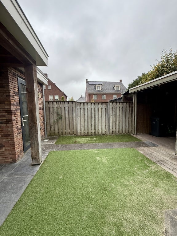 De tuin is onderhoudsarm, netjes aangelegd met kunstgras, berging , overkapping en achterom- klaar om van te genieten!