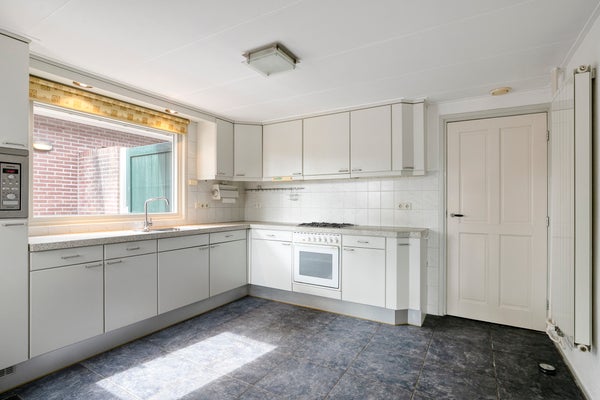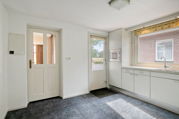 Vanuit de hal/entree is er toegang tot de meterkast en de woonkamer. Vanuit de woonkamer is er toegang tot een trapkast, de trapopgang naar de eerste verdieping en de keuken. De keuken in L-vorm is v.v. diverse kasten en lades, een terrazzo werkblad met spoelbak en mengkraan, een 4 pits gaskookplaat, afzuigkap, magnetron, koelkast en oven. Vanuit de keuken is er toegang tot de bijkeuken welke voorzien is van diverse inbouwkasten. Hier is tevens de cv-ketel gesitueerd. Vanuit de bijkeuken is er toegang tot een halletje met toegang tot de badkamer en het separaat toilet. De badkamer is geheel betegeld en v.v. een wastafel, douchecabine en een ligbad. Het toilet is geheel betegeld en v.v. een staand toilet en fonteintje.