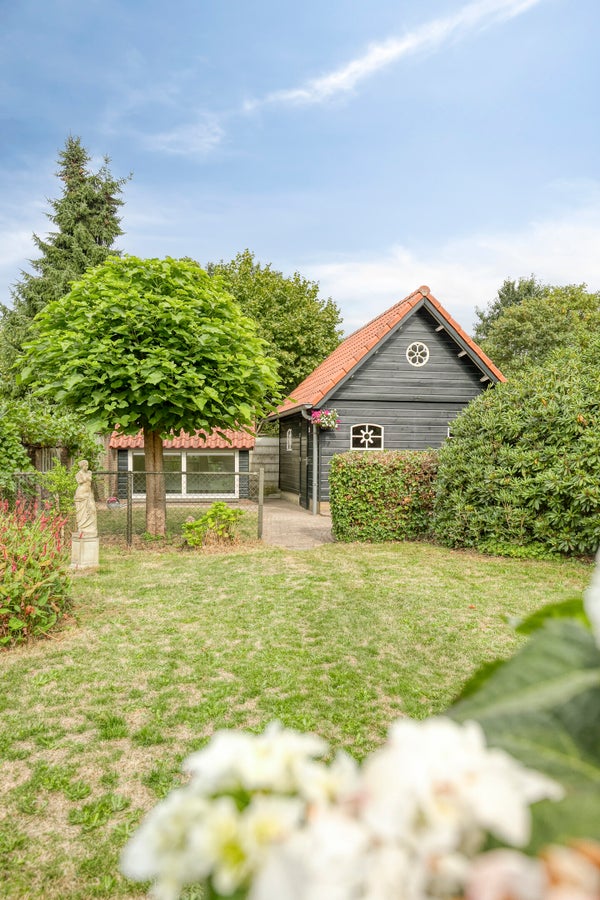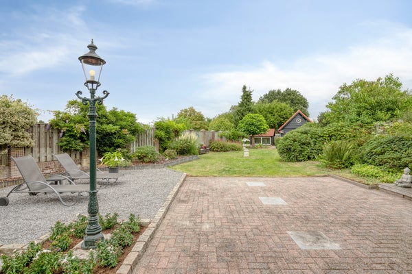 Aan de voorzijde van de woning is een royale inrit gelegen met ruimte voor meerdere auto's. Middels een houten poort is er toegang tot een royale achtertuin met hobbyruimte/tuinhuis en dierenverblijf. De vrijstaande garage is bereikbaar middels een roldeur en een aparte zijdeur en de carport is bereikbaar via een ijzeren sierpoort. De garage (bouwjaar 1997) is hoogwaardig gebouwd en volledig geïsoleerd. Aan de achterzijde van de garage is een houten terrasoverkapping aanwezig met verlichting en terrasverwarming. De tuin is aangelegd met sierbestrating, gazon, siergrind en borders met vaste beplanting. De voortuin is aangelegd met bestrating en siergrind.