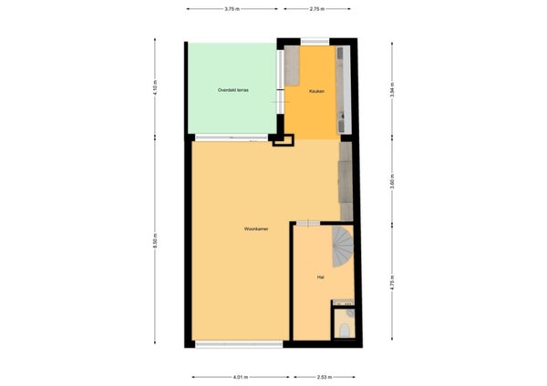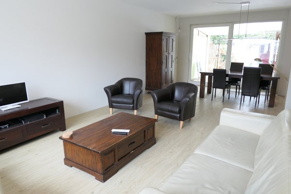 Ruime hal met toilet en trapopgang. Toegang tot woonkamer met aan de voorzijde het woongedeelte en aan de achterzijde het eetgedeelte met schuifpui naar overdekt terras en de keuken met achterdeur.