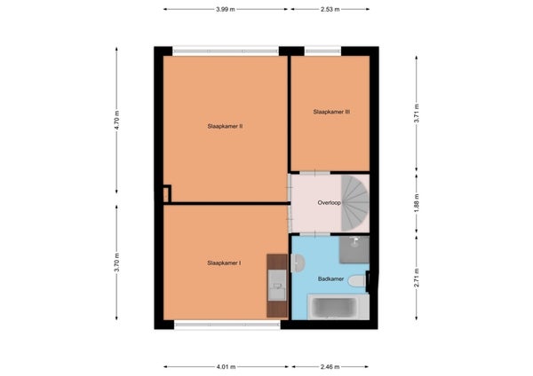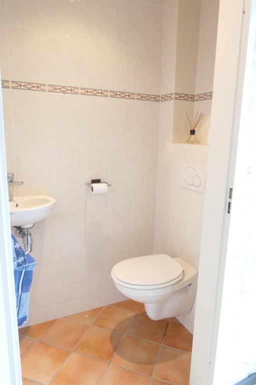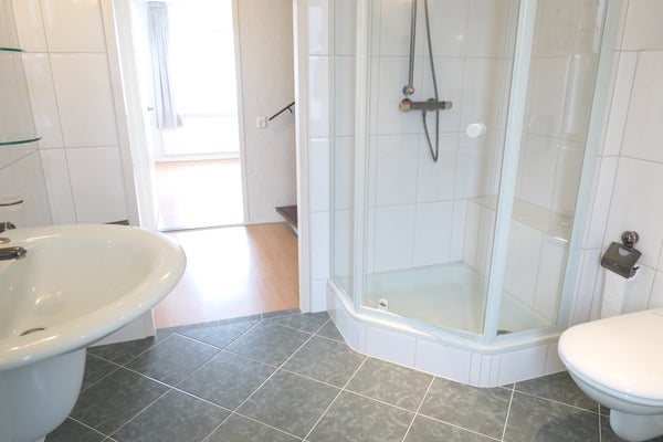 Op de eerste verdieping 3 slaapkamers van 19m2, 15 m2 en 9 m2. Badkamer met ligbad, douche, wastafel en toilet.