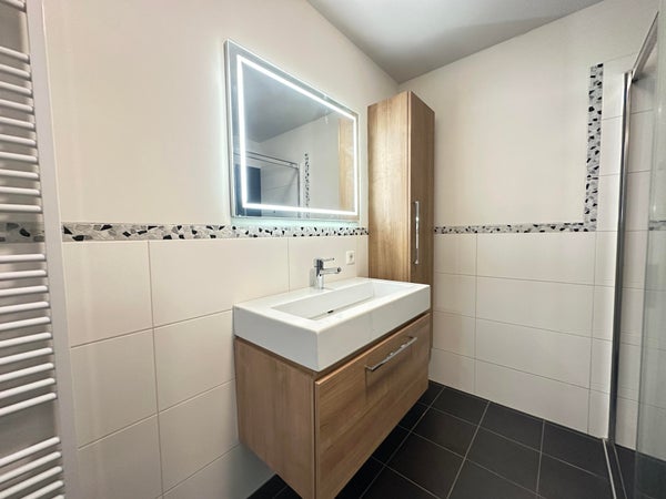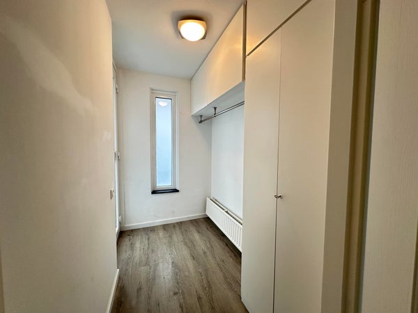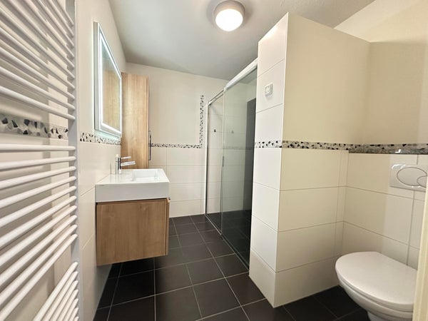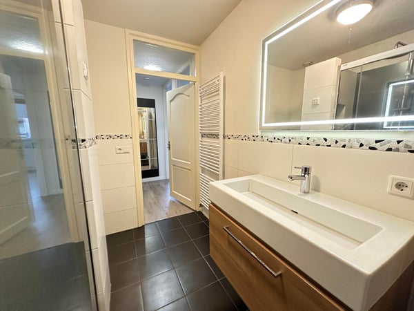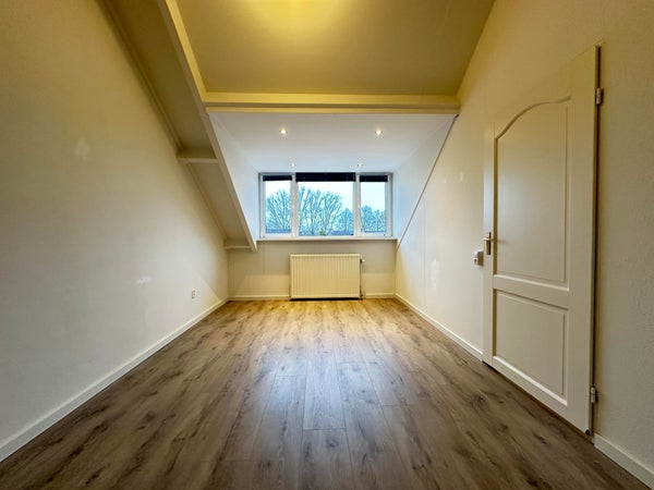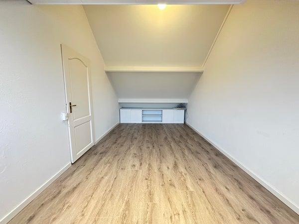 Overloop met toegang tot de slaapkamers en de badkamer. Slaapkamer 1 gelegen aan de voorzijde van de woning en ca. 20 m². Slaapkamer 2 gelegen aan de achterzijde en ca. 12 m². De volledig betegelde badkamer is voorzien van zeer ruime inloopdouche, wastafel met meubel en zwevend toilet.