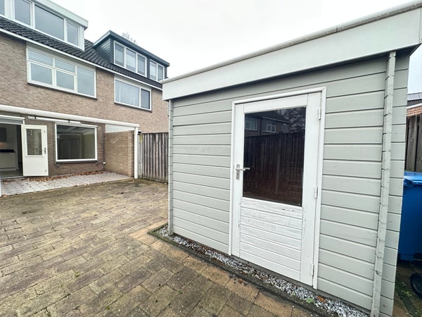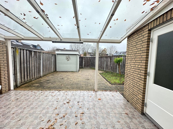 Ruime onderhoudsvriendelijke tuin met berging en overkapping. De tuin heeft tevens een achterom.
