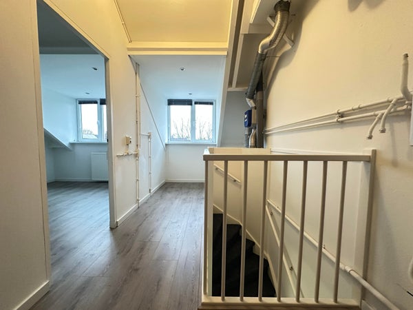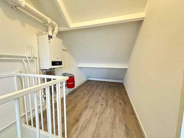 Middels trapopgang bereik overloop met wasmachine aansluiting en de opstelling van de CV. Slaapkamer 3 van ca. 16 m².