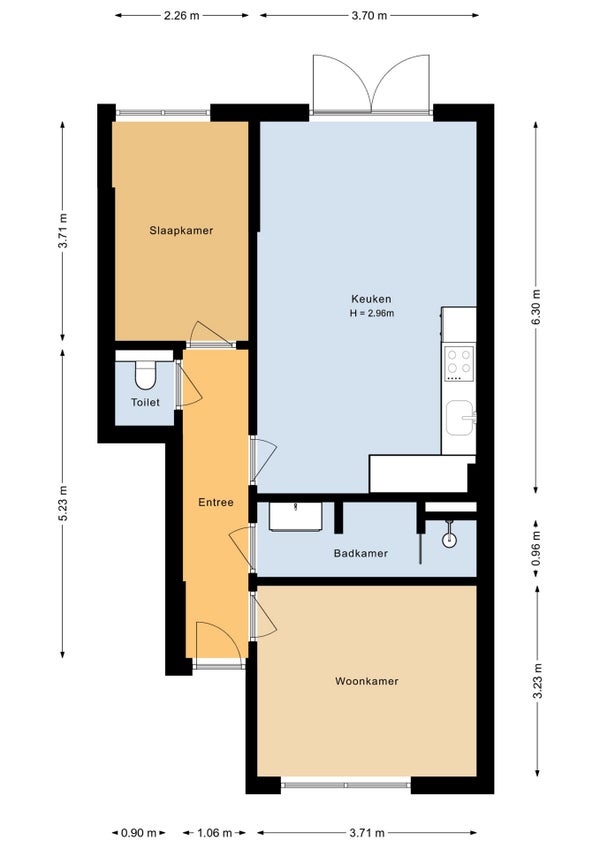 - kamers: twee waarvan twee slaapkamers een woonkamer met open keuken.
