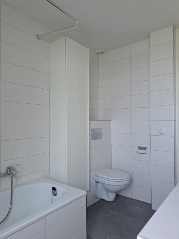 De moderne badkamer is voorzien van een toilet, ligbad met douche en dubbele wastafelmeubel met brede laden, spiegel en extra wandkast.