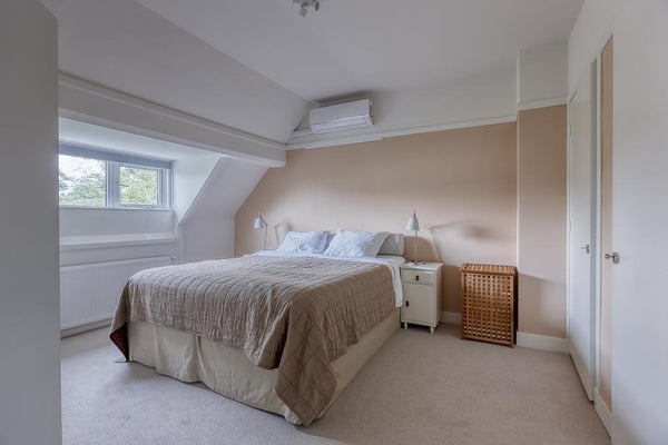 Slaapkamer in de nok met veel bergruimte.