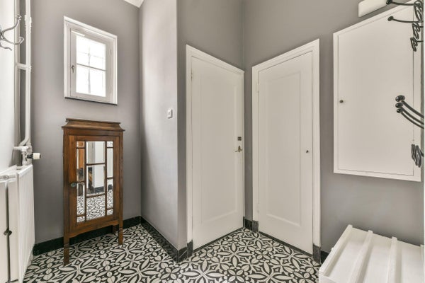 Entree in de vestibule met toegang tot de indrukwekkende hal. Deze beschikt over een monumentaal trappenhuis, een antieke fontein en originele kasteeldeuren welke toegang bieden tot de diverse ruimtes.