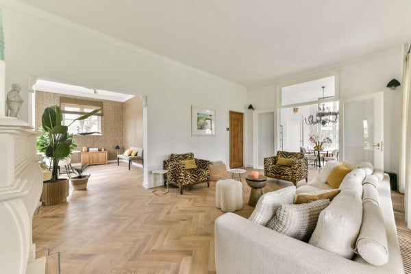 Tegenover de entree bevindt zich de woonkamer, voorzien van prachtige houten visgraatvloer en een sfeervolle, marmeren haard. De openslaande deuren naar de veranda en de tuin beslaan de gehele breedte van de ruimte. Zo worden binnen en buiten op charmante wijze met elkaar verbonden en heeft de ruimte veel natuurlijke lichtinval. Middels een doorgang is er toegang tot een tweede woonkamer, welke perfect zou kunnen worden gebruikt als bijvoorbeeld televisiekamer of werkkamer. Vanuit de woonkamer zijn er openslaande deuren naar de uitnodigende achthoekige eetkamer.