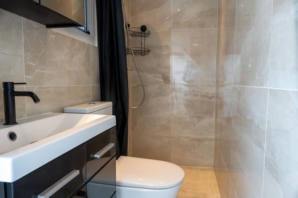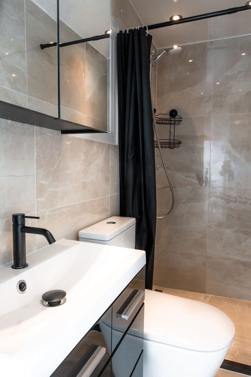 De badkamer is voorzien van een douche, wastafel + meubel en toilet