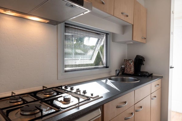 De keuken is voorzien van een koelkast met vriesvak, oven, gaskookplaat en afzuigkap