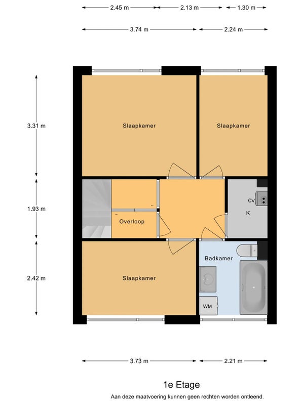 De trap in de woonkamer leidt naar de eerste verdieping, waar de overloop toegang geeft tot drie slaapkamers, de badkamer en een bergruimte met warmwatervoorziening. De grootste slaapkamer biedt volop ruimte voor een tweepersoonsbed en een royale kast. De overige twee kamers zijn flexibel inzetbaar als kinder- of logeerkamer, maar lenen zich ook uitstekend voor thuiswerken of hobby’s. De volledig betegelde badkamer beschikt over een ligbad met douche, een toilet, wastafelmeubel en aansluiting voor de wasmachine.