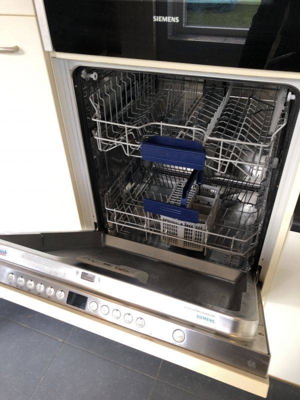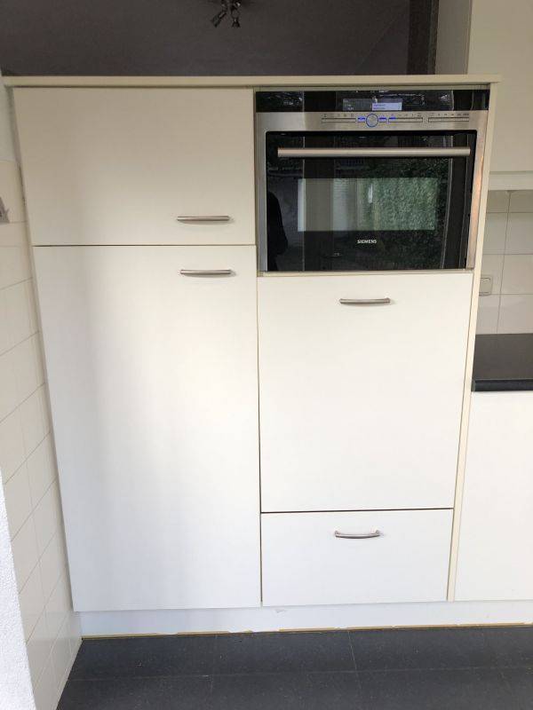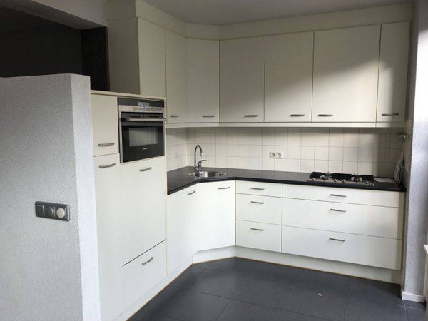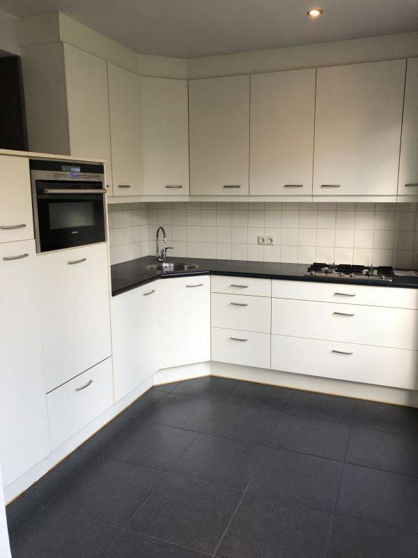 - Half open keuken in hoekopstelling voorzien van diverse onder -/en bovenkasten, kunststof aanrechtblad met spoelbak en mengkraan, gaskookplaat, afzuigkap, koelkast, vriesvak, oven/magnetroncombi, vaatwasmachine en deur naar tuin.