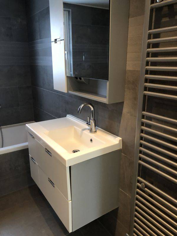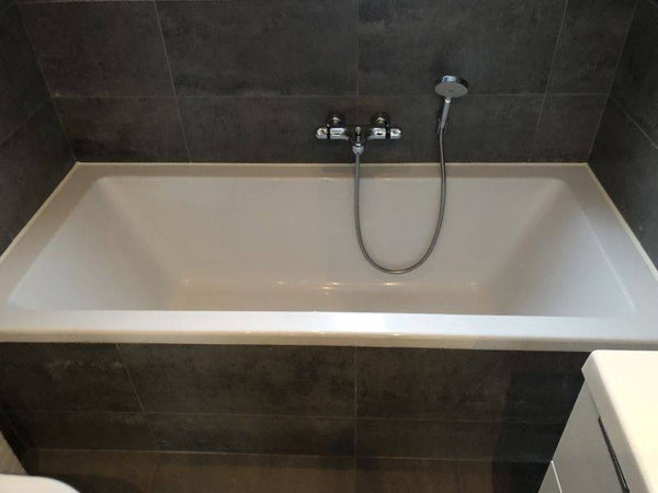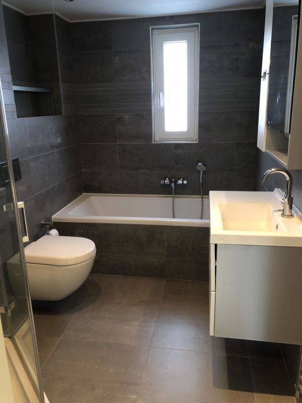 - Betegelde badkamer voorzien van een ligbad, aparte douche, vaste wastafel met meubel en tweede toilet.