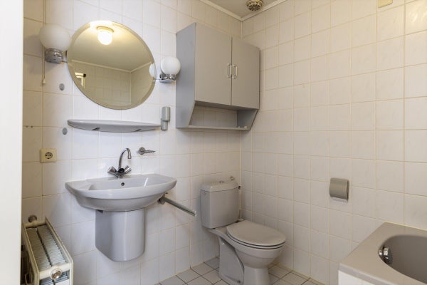 Aan de linkerzijde bevindt zich de ruime badkamer uitgevoerd met bad, separate douche, wastafel en tweede toilet.