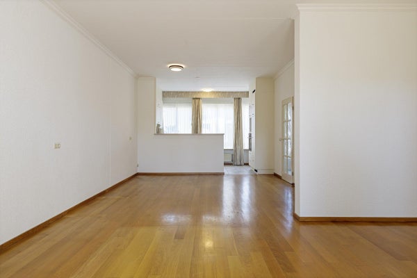 Door de grote raampartijen is de woning erg licht. De woonkamer is uitgevoerd met een houten vloer.