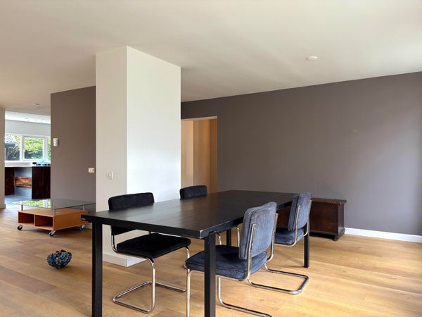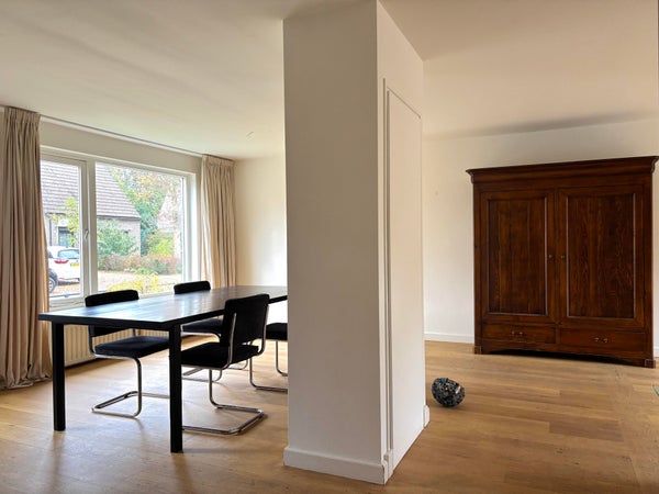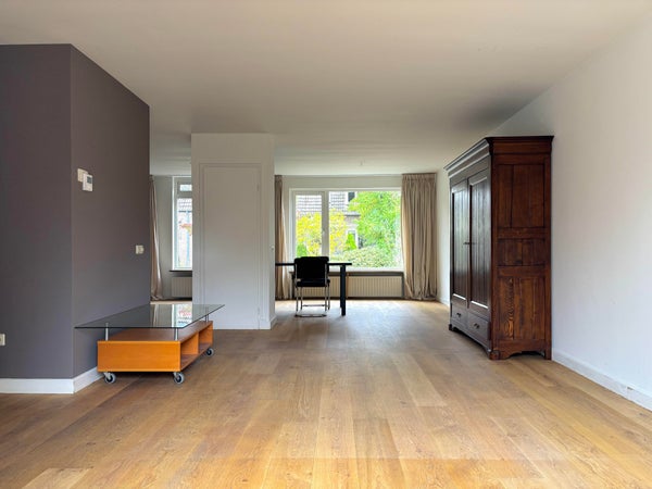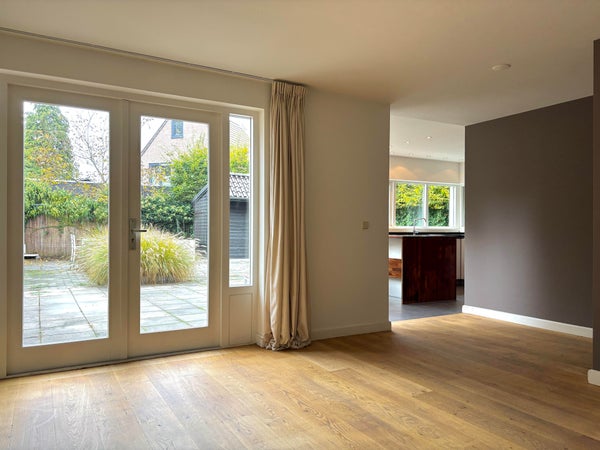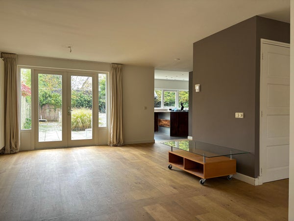 De woonkamer is voorzien van houten vloer, heeft zeer veel lichtinval en is circa 40m2. Daarnaast heeft de woonkamer openslaande terrasdeuren naar de tuin.