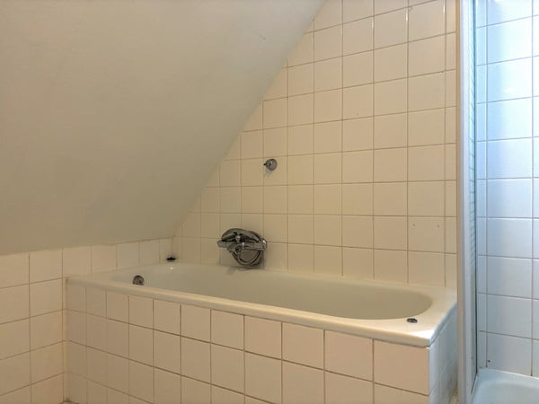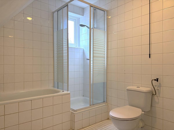De badkamer is voorzien van een wastafel, toilet, ligbad en separate douche.