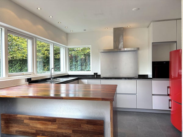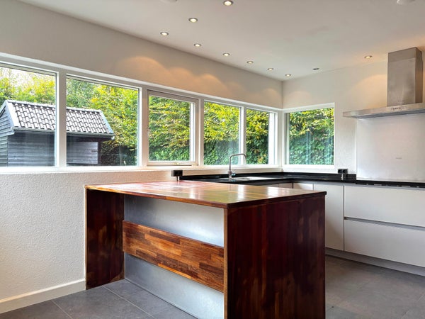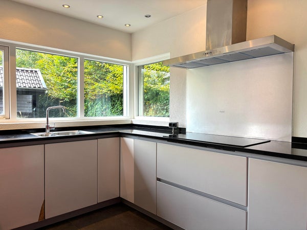 De half open greeploze keuken is zeer luxe ingericht. Deze is o.a. voorzien van een design afzuigkap en kookplaat.