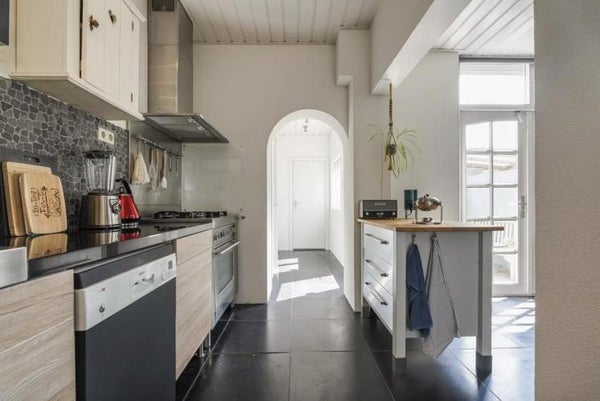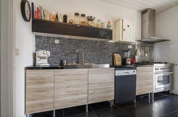 De keuken is voorzien van een gasfornuis met oven, vaatwasser en afzuigkap.