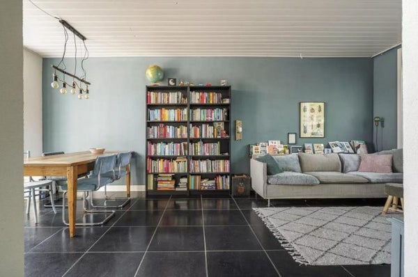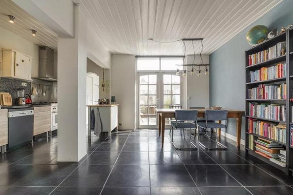 Entree in de hal met trapopgang naar de eerste etage en doorloop naar de woonkamer. Ruime en lichte woonkamer met open keuken en dubbele openslaande deuren naar de tuin.