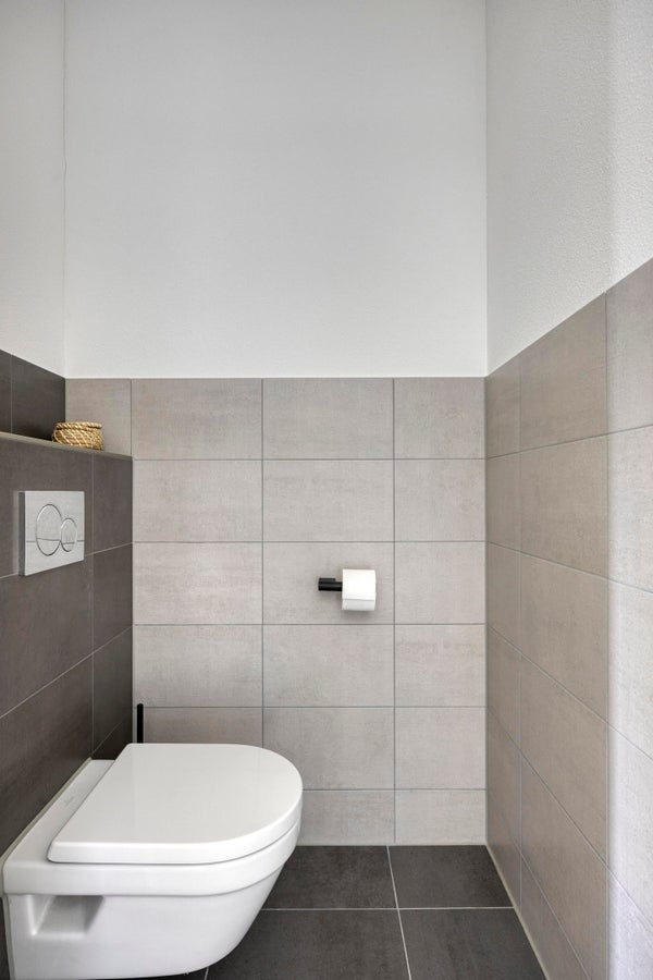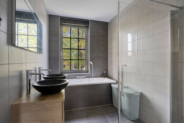Via de hal, met garderobe en toilet, bereikt u de eerste verdieping. Hier bevinden zich drie ruime slaapkamers, een moderne badkamer en een apart toilet. De master bedroom ligt aan de voorzijde van de woning. De badkamer is modern uitgevoerd en voorzien van een inloopdouche, ligbad, dubbele wastafel en handdoekradiator.