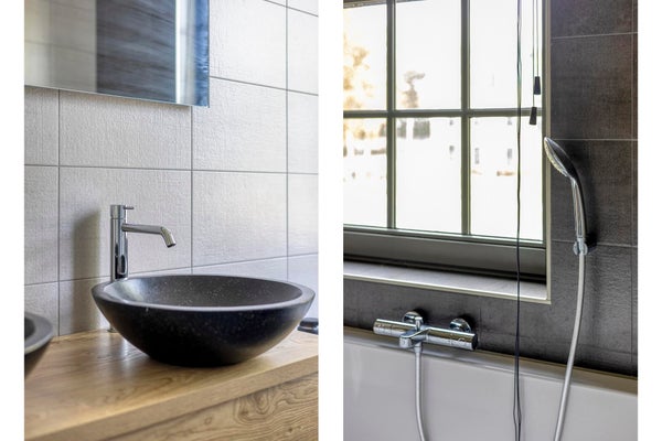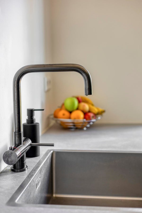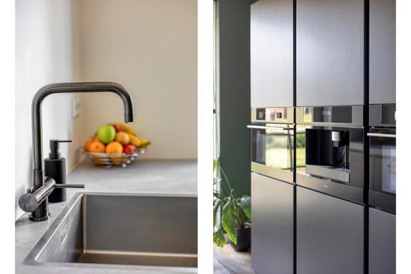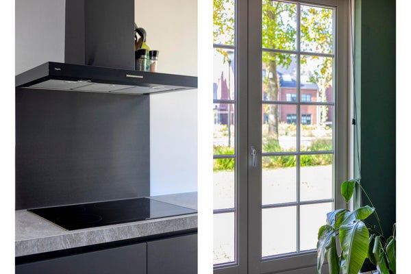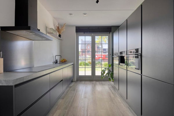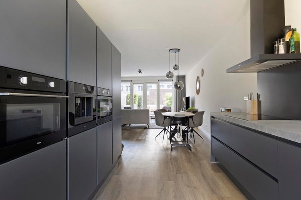 De moderne keuken is voorzien van alle gemakken, waaronder een dubbele oven, combi-magnetron, inductiekookplaat, afzuigkap, vaatwasser, koelkast en vriezer. Daarnaast is er veel kastruimte, aangevuld met een handige trapkast.