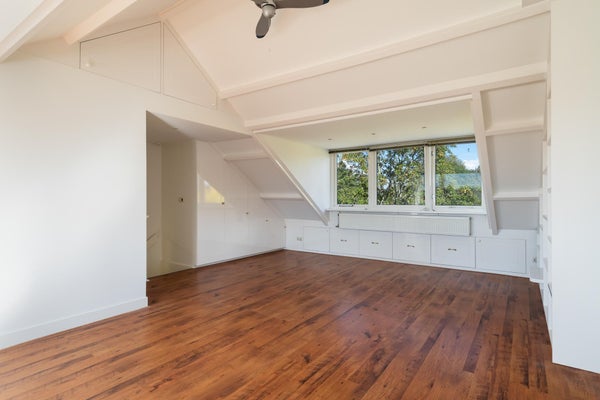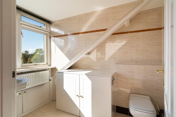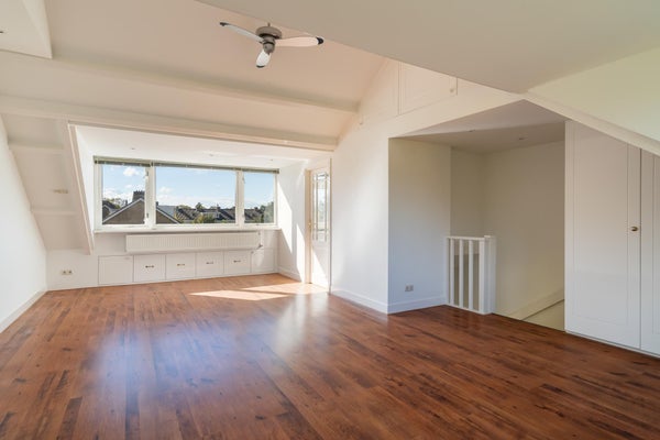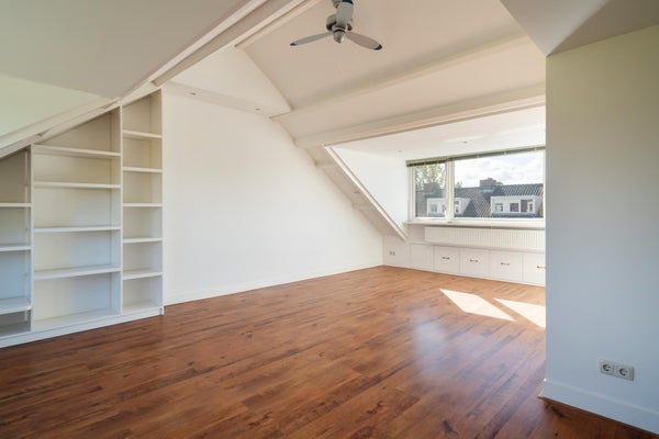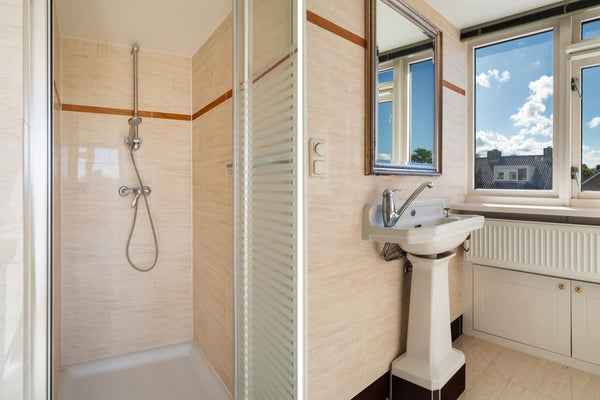 Grote zolderslaapkamer met twee dakkapellen, "laundry" met opstelplaats voor de wasapparatuur en CV-combiketel, tweede badkamer met douche, toilet en wastafel.